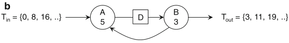 Schaumont, Figure 2.15 - Estensione del modello SDF con risorse: latenza di attori, buffer per code FIFO