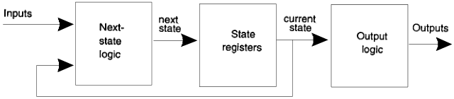 this may be reduced to the flip-flop clock-to-q delay by computing outputs based on the next state and by placing registers before outputs