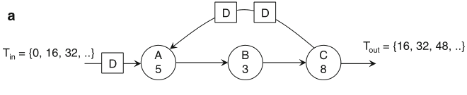 Schaumont, Figure 2.15 - Estensione del modello SDF con risorse: latenza di attori, buffer per code FIFO